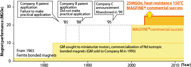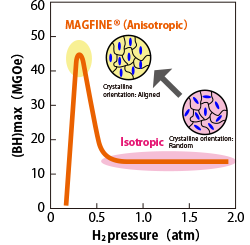 Our MAGFINE? (abbreviation MF) NdFeB anisotropic bonded magnets have world leading 25MGOe magnetic force and 150 degree heat resistance. The world’s strongest NdFeB magnets were discovered in 1982 and produced as sintered magnets and isotropic bonded magnets. Isotropic bonded magnets lose their magnetic properties over time, so for twenty years many worked to develop high performance anisotropic magnetic powder. Aichi Steel discovered the manufacturing principles for anisotropic magnetic powder (d-HDDR method) and succeeded in bringing anisotropic bonded magnets to market.