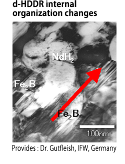 In the reaction between the NdFeB alloy and hydrogen, first a 2-phase structure is formed with a lamellar structure of Fe containing supersaturated B and NdH. The ferrous phase has deformation in one direction caused by the lamellar structure and the Fe B phase is observed forming aligned orientation as a crystal to mitigate the deformation (figure on right). In the hydrogen release process, the Fe B phase is recrystallized and the orientation of the crystals is aligned. That is, the Fe B phase functions as a phase with memory of the orientation before the reaction. This unique metallurgical anisotropic mechanism is presented as a TM (texture memory) effect.