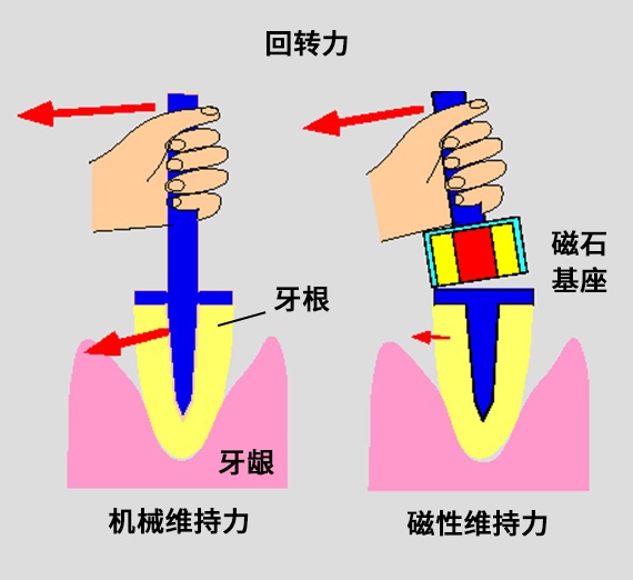 一般的義齒通過復(fù)雜的裝置強(qiáng)力地固定在牙根上,再加上較強(qiáng)的回轉(zhuǎn)力就會造成基座損傷,從而危害至牙根。